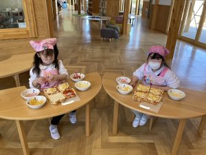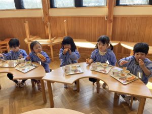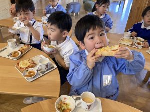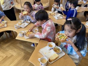 待ちに待ったお給食の時間がやってきました。大きなお口でいただきまーす😋🍕