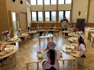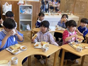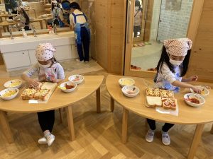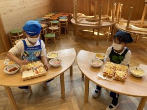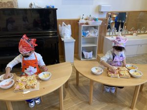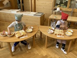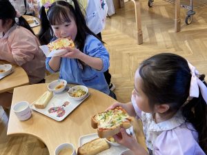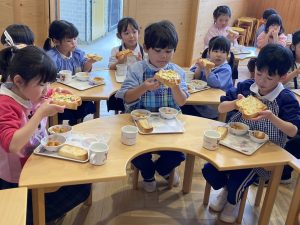 自分の作ったピザが美味しく焼きあがりました。小さいクラスの子ども達もお兄さんお姉さんが作ってくれたピザを美味しそうにパクパク食べていました。
