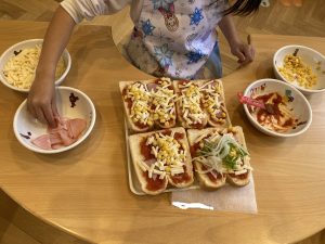 食パンにピザソースを塗って、チーズ、コーン、ハムを乗せます。小さいクラスのお友だちの分も頑張って作りました。