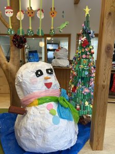 12月24日(水)は子ども達が楽しみにしていたクリスマス会。手作りのクリスマスツリーに飾りつけをし、雪だるまもドーンと子ども達の登園を待っています⛄