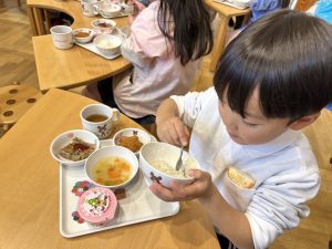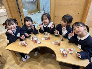 お給食はツリーを囲んでいただきました。みんなニコニコで美味しそう。