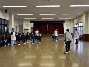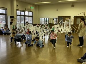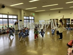 次はみんなでゲームをしました。年長クラスの子ども達が考えた「大雪がきたぞー」というゲームです。ルールの説明や進行も子ども達で行いました。