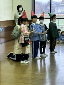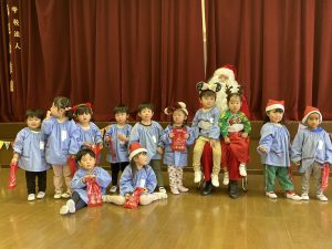 みんなでホールに集合しました。まず「あわてんぼうのサンタクロース」「赤鼻のトナカイ」のお歌を歌いました。