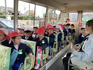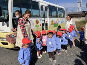 2歳児クラス、年少クラス、年中クラス、年長クラスでバスに乗って出発です。2歳児クラスは初めての園外保育なのでウキウキしています。