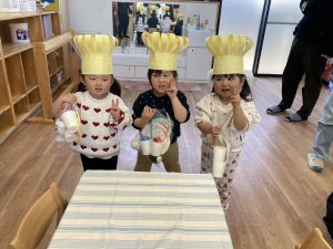 2歳児クラスはコックさんの帽子を作りました。のりを上手に使って可愛らしい帽子が完成しました。