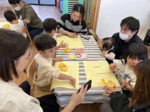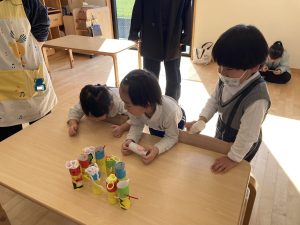 年中クラスは鬼のボーリング遊びをしました。お父さんお母さんと一緒にトイレットペーパーの芯を使って鬼をつくりました。