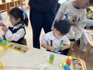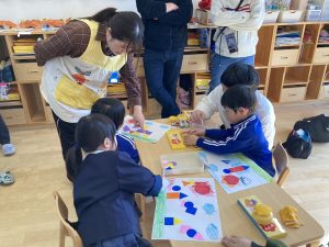 年少クラスは形あそびをしました。線をなぞったり、〇△☐を使って形を作ったり、周りにクレヨンで色々な絵を描いて、素敵な絵を完成させました。