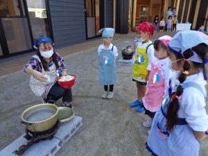 お昼ご飯にうどんを食べて元気いっぱいの子ども達は、エプロンと三角巾を付けて、良く手を洗ったら、いよいよクッキングスタートです🍲