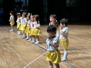 2歳児クラスの子ども達は、お揃いの黄色いスカートと半ズボン、お花がかわいい衣装で「プリプリ ハッピー」のお遊戯を踊りました。