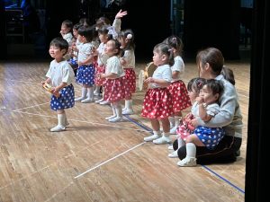 1歳児クラスの子ども達は「おもちゃのチャチャチャ」の曲に合わせて楽器遊びをしました。水玉の衣装が可愛らしいです。大きな舞台にびっくりして泣いてしまった子もいますが頑張ってできました。