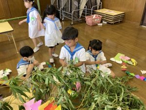 はじめにお家に飾る小さい笹に自分で作った七夕飾りを飾りました。輪飾り、三角四角つなぎ、貝飾り、スイカや流れ星・・・などなどとてもきれいに飾りつけできました🌟