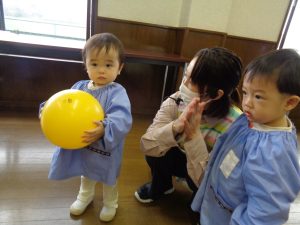 ボールを上に投げて拍手をしたり、お友達とパスをしたり、頭の周りや腰の周りをグルグル回したり、滑り台キャッチなど、いろいろな遊び方を教えてもらい楽しそうな子ども達!