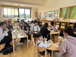 お昼ご飯はお父さんとお母さんと一緒にお給食を食べました。いつも幼稚園で楽しく食べている雰囲気を感じてもらうことができました。おかわりもたくさいただいてお腹いっぱいの子ども達でした😊