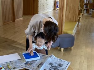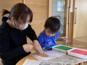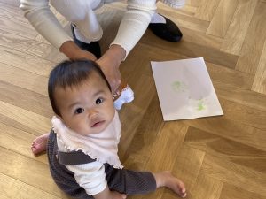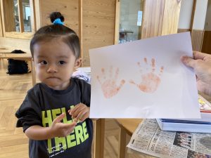 まずはじめに手形を取りました。好きな色でかわいい手の形ができました✋