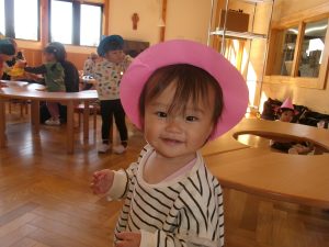 可愛い帽子も作り、好きな模様を貼りました🍬 とても似合っています😊