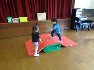 今回はサーキット運動遊びを行いました。やまべひよこ園のうさぎ組のお友達も一緒に遊びました。