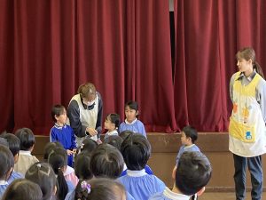 お誕生日のお友だちが入場し、みんなでバースデイソングを歌ってお祝いをしました。プレゼントをもらいとても嬉しそうでした。