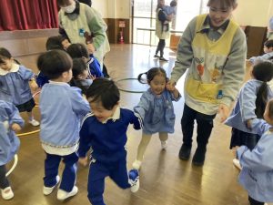 2月はバレンタインがあったのでバレンタインバージョンのフルーツバスケットを行いました。チョコレートやクッキーなど自分のチームが鬼に呼ばれてしまうのではないかとドキドキ💗