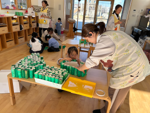 トイレットペーパーの芯に絵の具を塗って乾かします。予定では400個必要となったので、幼稚園のみんなにお家から持ってきてもらいました。