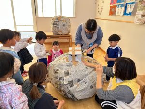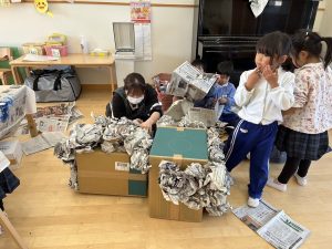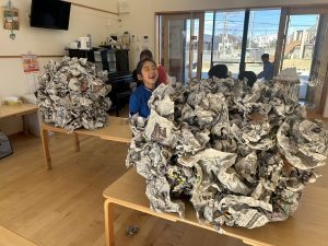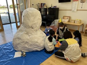 雪だるまは大きくなダンボールに新聞を丸めてくっつけて、丸い形を作りました。仕上げに白い紙を巻きます。目鼻口、帽子も飾ってだんだん完成です。