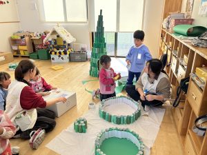 はじめにツリーと雪だるまのミニチュアを作ってみてほんとに作れるか試してみました。「この方法ならできるね」と確信し園長先生にも見てもらいました。